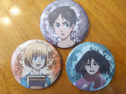Eren, Mikasa and Armin 2.25 Pin Back Buttons with FREE STICKER